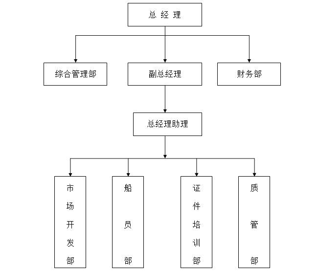 公司為了更好服務(wù)于船員和航運(yùn)企業(yè)、相關(guān)合作單位等,廈門海盈海運(yùn)特設(shè)立了總經(jīng)理直轄管理的副總經(jīng)理( 崗位)及綜合管理部、財(cái)務(wù)部等,同時(shí)設(shè)立總經(jīng)理——副總經(jīng)理——總經(jīng)理助理順序垂直管理的四個(gè)職能 部門:市場(chǎng)開發(fā)部、船員部、證件培訓(xùn)部、質(zhì)管部,為船員服務(wù)管理業(yè)務(wù)和其他業(yè)務(wù)提供有力的人力資 源和對(duì)口崗位保障。組織機(jī)構(gòu)圖如下: